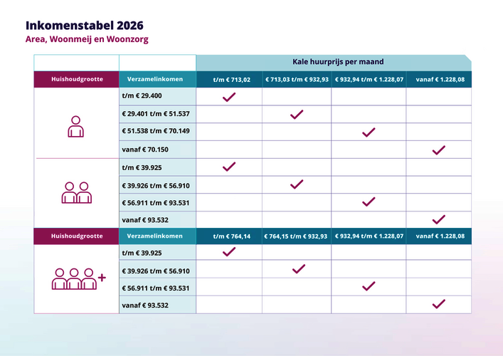 Heb je een inkomen boven de € 29.400 (1 persoons) of boven de € 39.925 (meerpersoons) (prijspeil 2026)? Dan kan een woningcorporatie verschillend omgaan met de toewijzing van woningen.